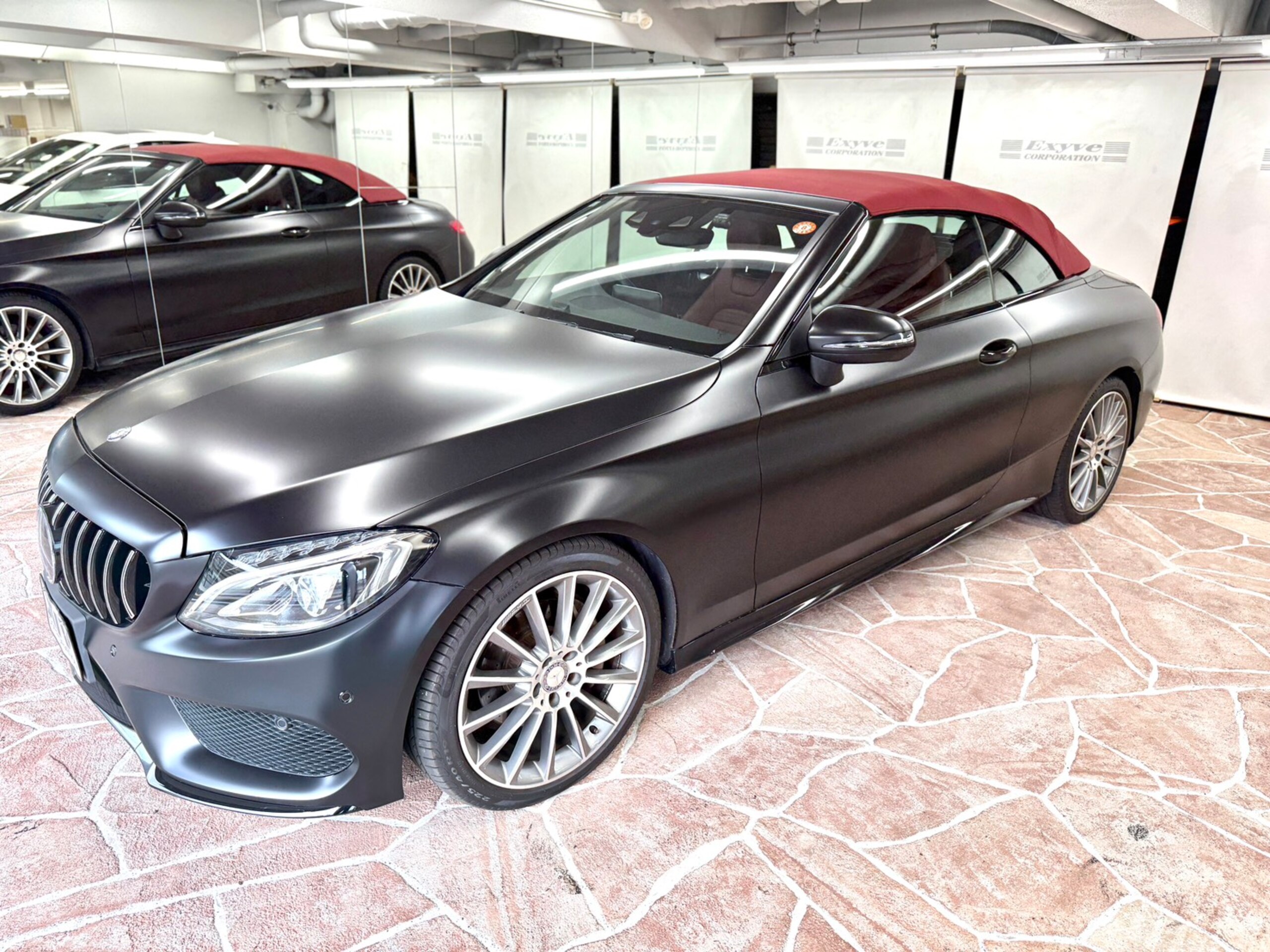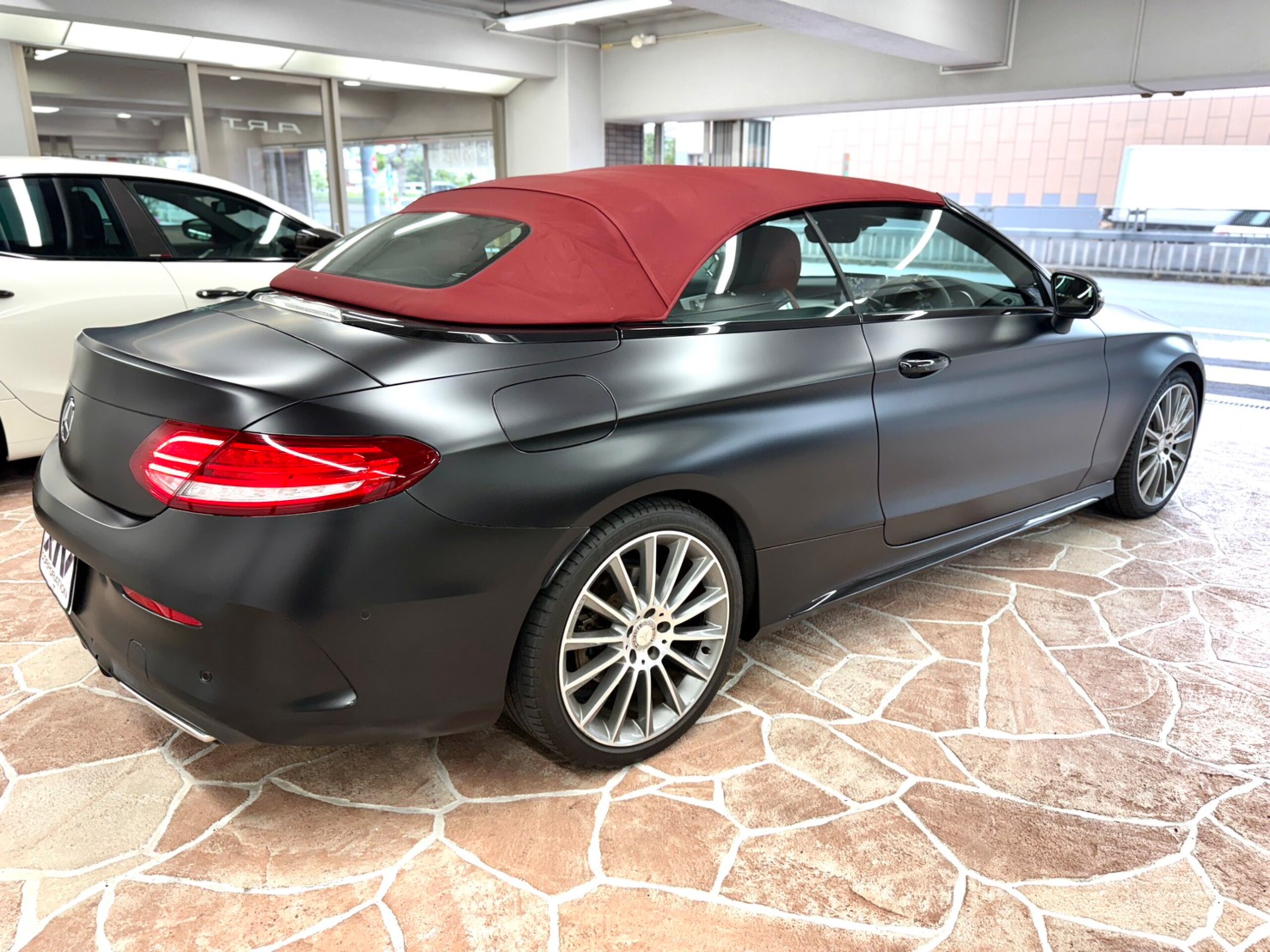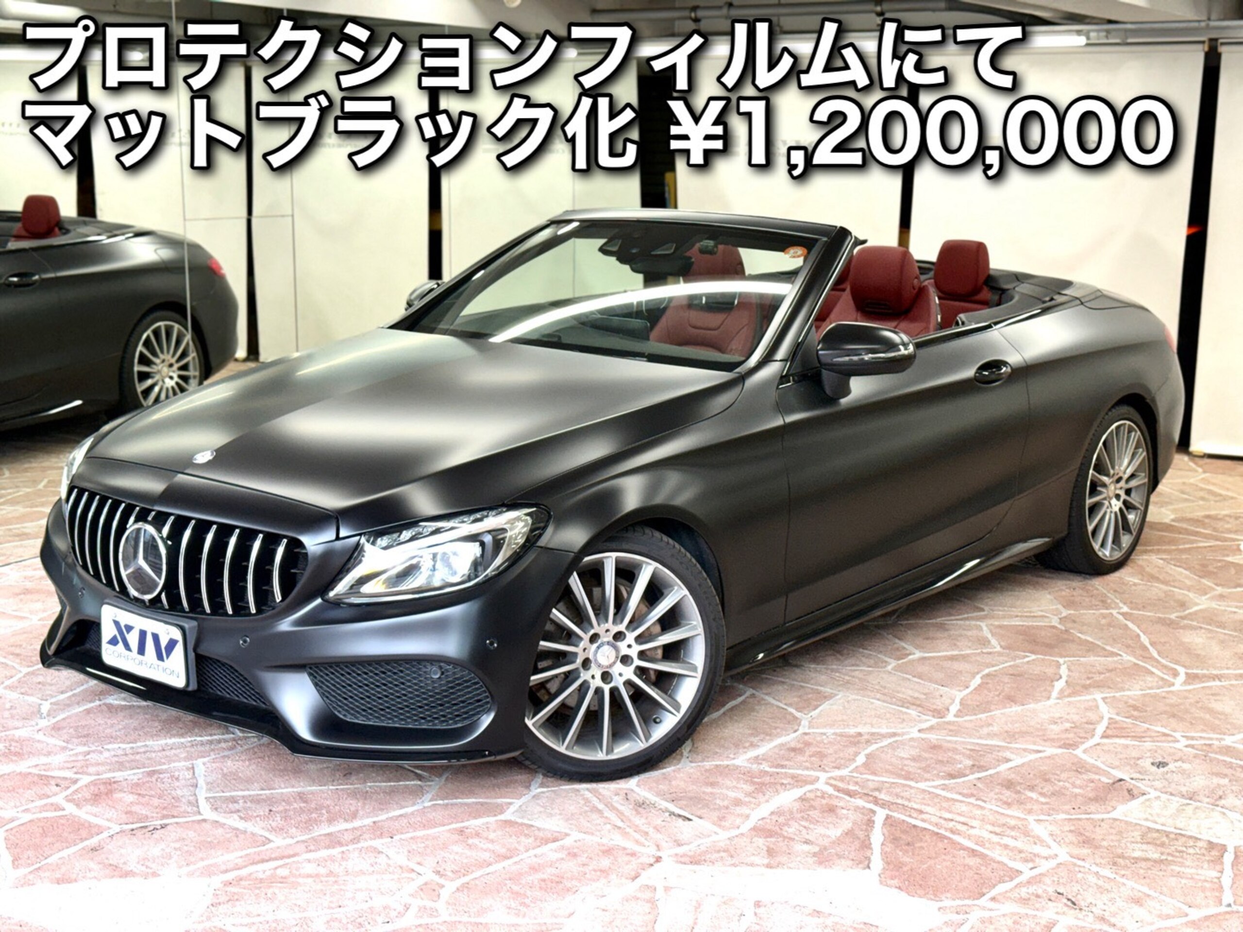 ステルスフィルム(マットブラック)&ローダウンにカスタムされたC180カブリオレスポーツになっております!